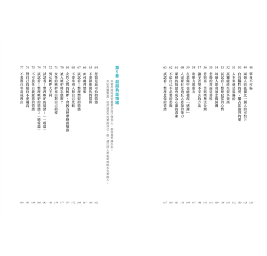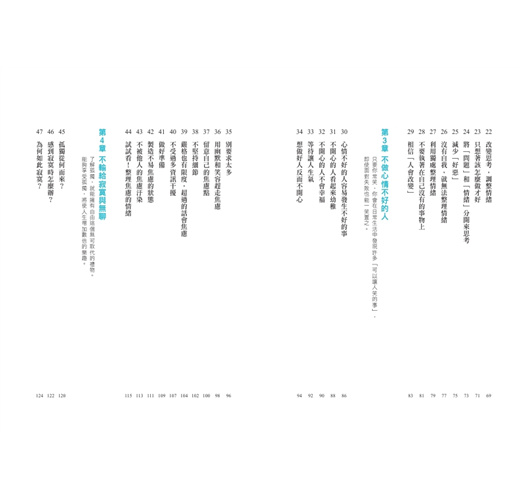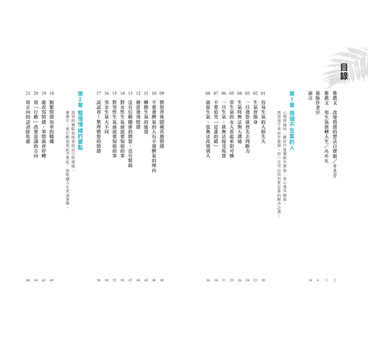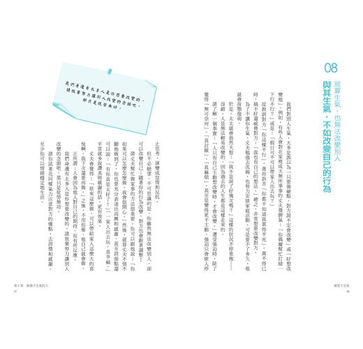 長期受負面情緒所苦的人不容易靠自己產生新的想法,《練習不生氣》這本書提供了許多新想法的靈感,舉凡生氣、焦慮、寂寞、怨恨,嫉妒,甚至失去熱情等,作者針對這些負面情緒提供了許多不同角度的想法,相信你一定能從這個百寶箱裡找到幾個讓自己受益無窮的新想法!
