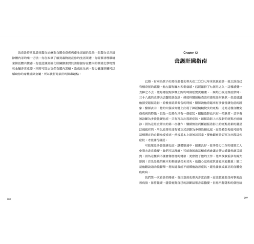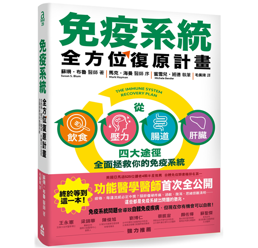 ․在治療自體免疫疾病時,蘇珊‧布魯醫師考量的是全人,採用食療、認識壓力、打造健康的消化道、維護肝臟功能等實用的治療方式。《免疫系統復原計畫》是治療所有自體免疫疾病成因,賦予患者力量的創新方式。