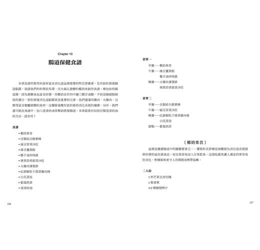 從過敏、壓力、腸道、肝臟四大治療途徑,分門別類提供多個進行食療需要的食譜。