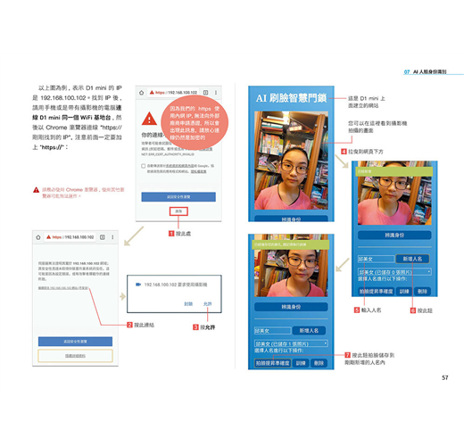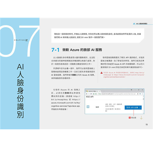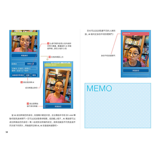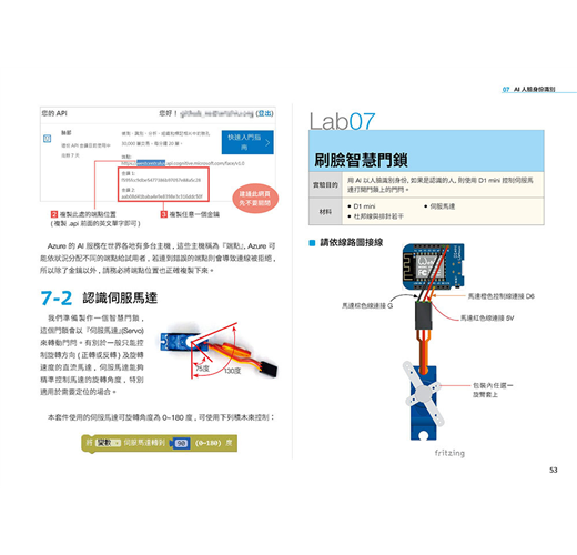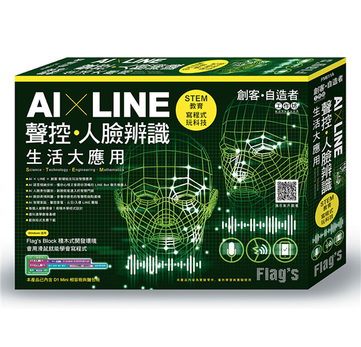 第 1 章 用積木設計 Maker 程式 第 2 章 火災偵測 LINE 警報器 第 3 章 360 度防盜 LINE 警報器 第 4 章 溫度偵測 LINE Bot 查詢機器人 第 5 章 AI 語言情緒分析 LINE Bot 聊天機器人 第 6 章 AI 語音聲控電源插座 第 7 章 AI 人臉身份識別 - 刷臉就能進入的智慧門鎖 第 8 章 AI 臉部表情辨識 - 會看你臉色的智慧歌曲點播機