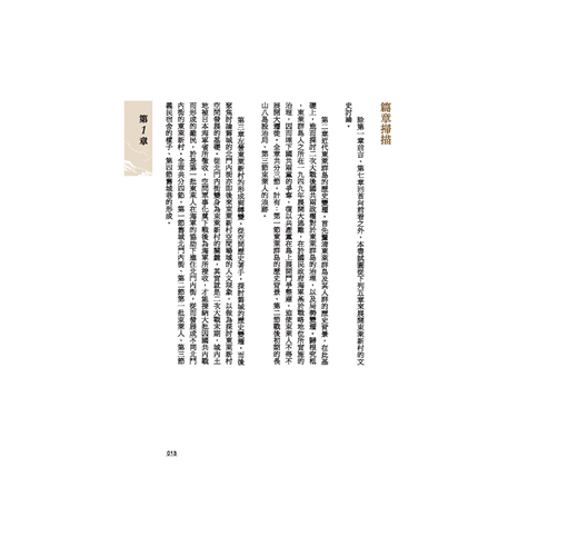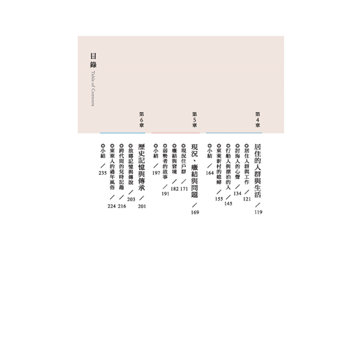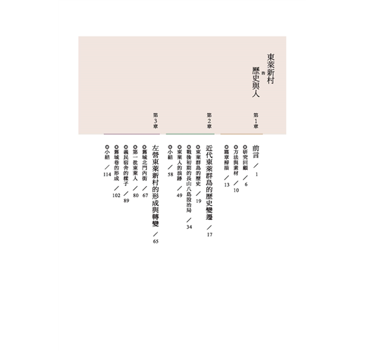 除第一章前言、第七章回首向前看之外,本書試圖從下列五章來展開東萊新村的文史討論。
