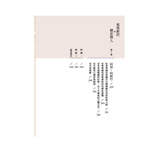 第六章歷史記憶與傳承。本章從歷史記憶著手,主要運用訪談資料,試圖勾繪當年還是青少年的東萊耆老,他們對故鄉的記憶,這樣的記憶有何共通性。此外,這樣的歷史記憶在跨代之間有無落差也是本章關心的議題。
