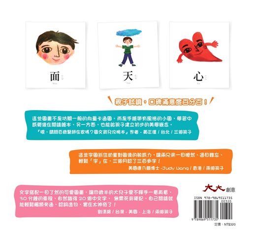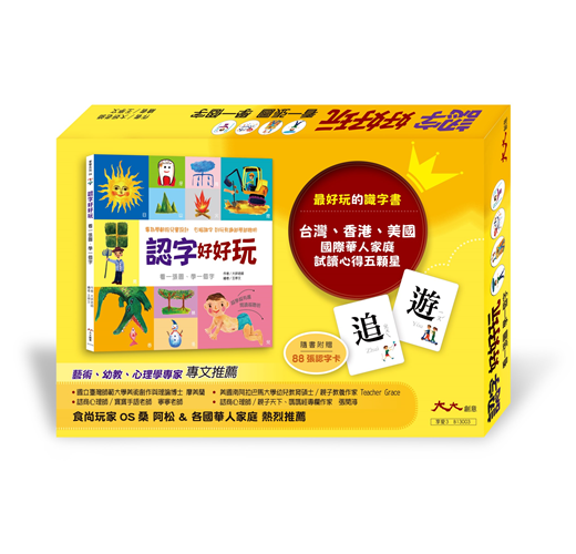 對旅居各地、缺乏穩定中文學習環境的我們家來說,大妍這套識字書真是一大福音!文字搭配一目了然的可愛圖畫,讓四歲半的大兒子愛不釋手一看再看,30 分鐘的車程,自然識得20 個中文字,無需死背硬記,自己閱讀就能輕鬆觸類旁通、認詞造句,實在太神奇了!
