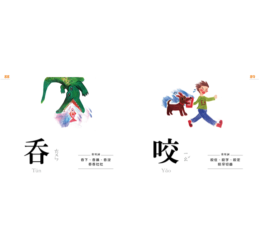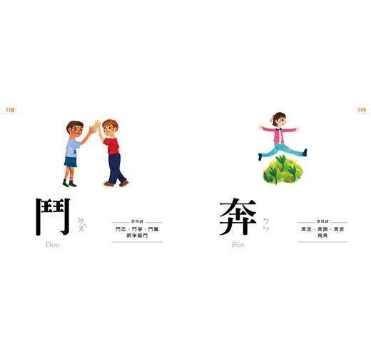 1. 家長陪伴孩子閱讀本書時,可隨孩子的年齡與認知程度自行分配識字的進度與順序,一天教學幾個字,或是持續幾天從頭到尾看讀一次,都能得到很好的效果。教學時,家長可用一至兩句話講解圖像與文字的關係,或是問孩子:「你覺得為什麼是__ 呢?」,由孩子發揮想像力來描述看到的圖文,更能加強圖像與文字的連結。