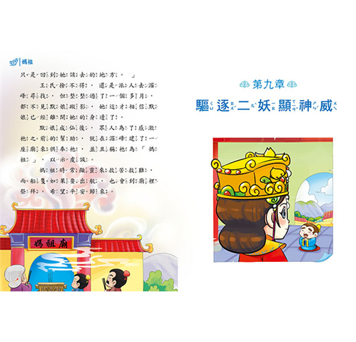 臺灣的媽祖信仰歷史悠久,而每年農曆三月,各大廟宇舉辦的媽祖遶境活動已是全台盛事。本書以生動精采的傳奇故事,敘述媽祖在成仙前有「海上救父」、「化草為木」、「逐吉蓼怪風」等以神力助人的事蹟。在祂二十八歲得道成仙後,依舊繼續救苦救難,不僅與千里眼、順風耳、晏公鬥法,甚至將祂們收歸門下,要祂們一起守護百姓,讓大家生活更加安穩平順。