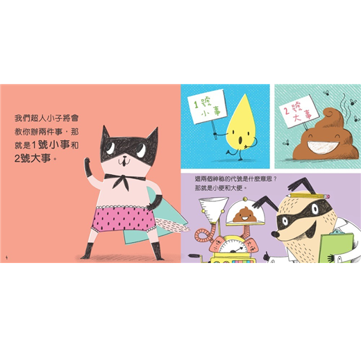 快來跟着超人咚咚和超人噓噓學習辦兩件事──1號小事和2號大事。這兩個神秘的代號是什麼意思?當然是小便和大便啦。