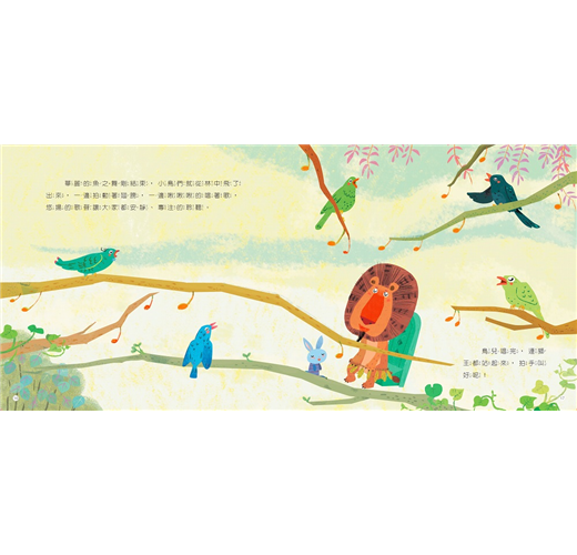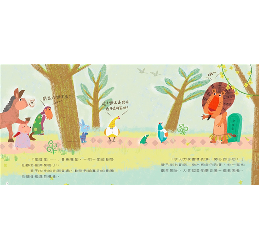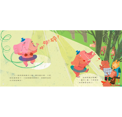此書改編自聖桑的《動物狂歡節》,柔和色調搭配流線型的構圖,彷彿音符也融合在畫裡,翻閱時感覺和諧、輕快又流暢。畫面以全版跨頁的方式呈現,宛如觀看著一場又一場的表演。在每次翻頁前,不妨讓孩子靜下心、閉上眼,仔細聆聽音樂,猜猜接下來上場表演的會是誰,相信你會對孩子的想像驚嘆不已,孩子也會因為自己的參與,滿心期盼接下來的故事情節。