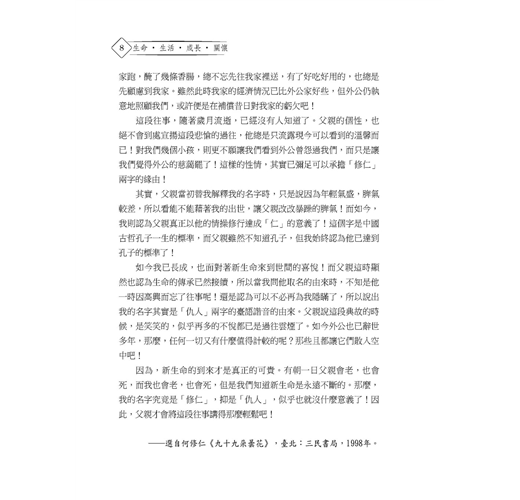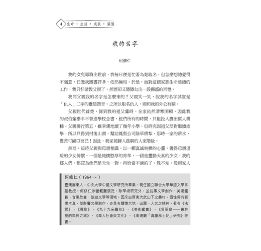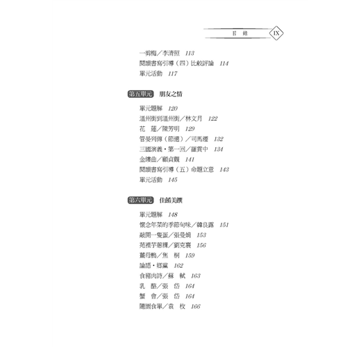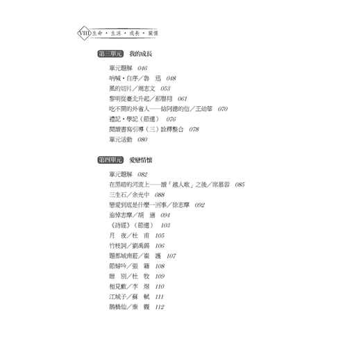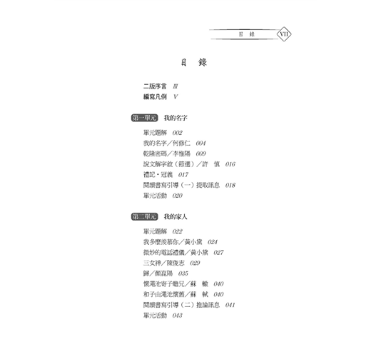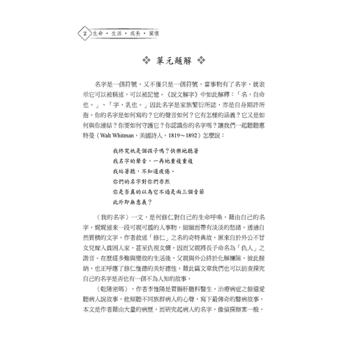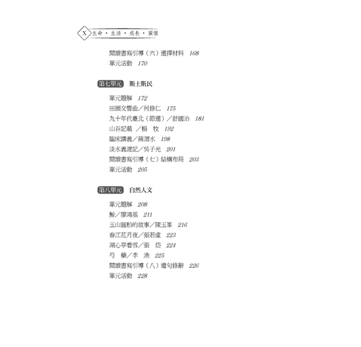 全書計分八大單元:我的名字、我的家人、我的成長、愛戀情懷、朋友之情、佳餚美饌、斯土斯民、自然人文等。除篇章選讀外,並有「閱讀與寫作歷程引導」,期能提升學生閱讀書寫能力。另設計八個單元活動,藉由與單元文本相呼應的作業,並要求設計具創意性的多媒體方式展現學習成果,讓課堂多了雙向互動的樂趣。透過本教材,學子們得以直指心靈本真,喚起相應感受及反思能力,最終得以收藏永恆價值記憶。