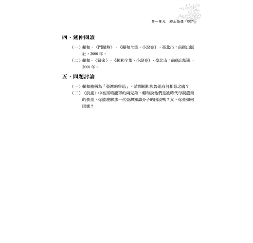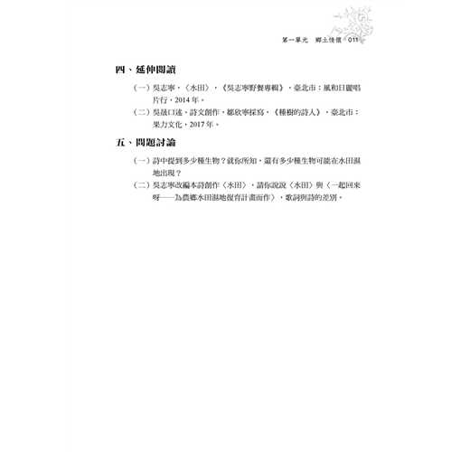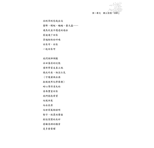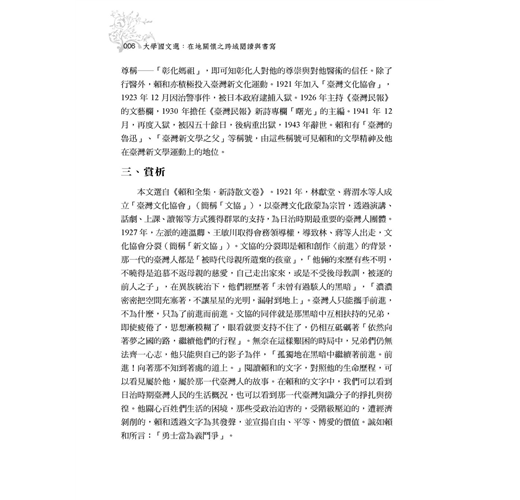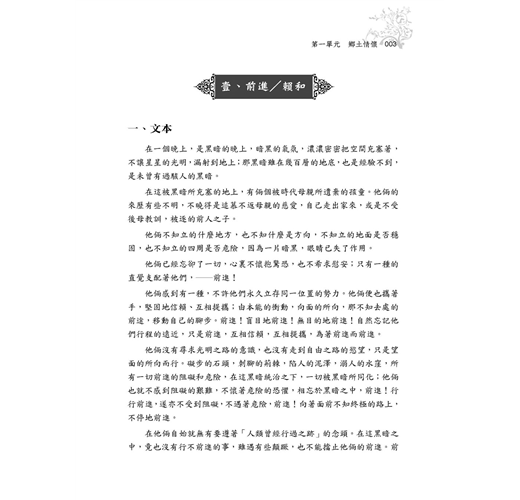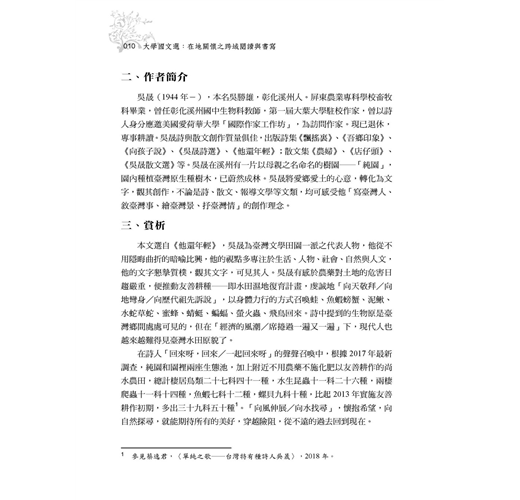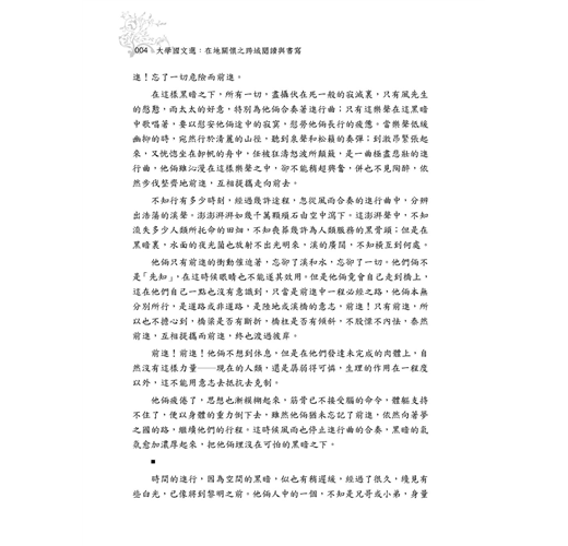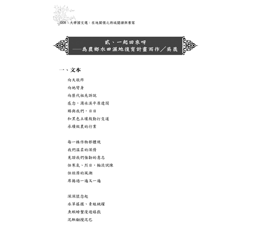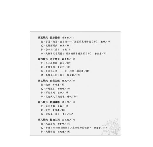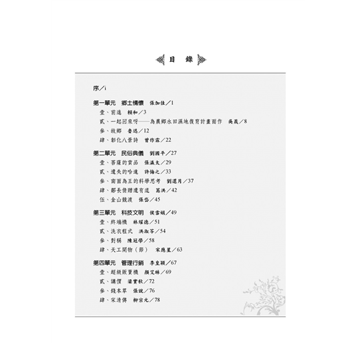 讀本共分九大單元,對應本校七大學院相關院系與通識鄉土情懷、民俗典儀領域,選文兼顧不同院系需求。在教學上,通識領域與學生所屬院系之單元,為必授內容,教師另就自我課程規劃,教授其他院系單元課程。透過跨域讀寫,啓迪在地自覺,涵容全球視野。