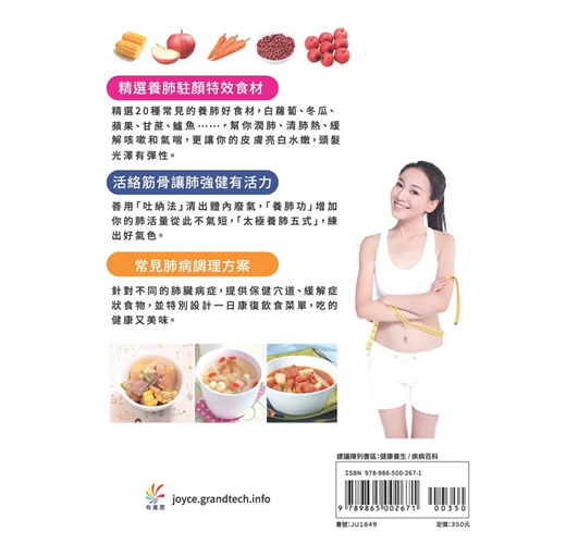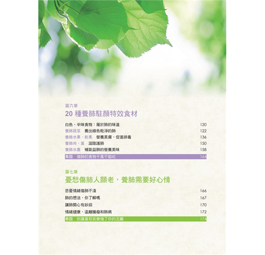針對不同的肺臟病症,提供保健穴道、緩解症狀食物,並特別設計一日康復飲食菜單,吃的健康又美味。