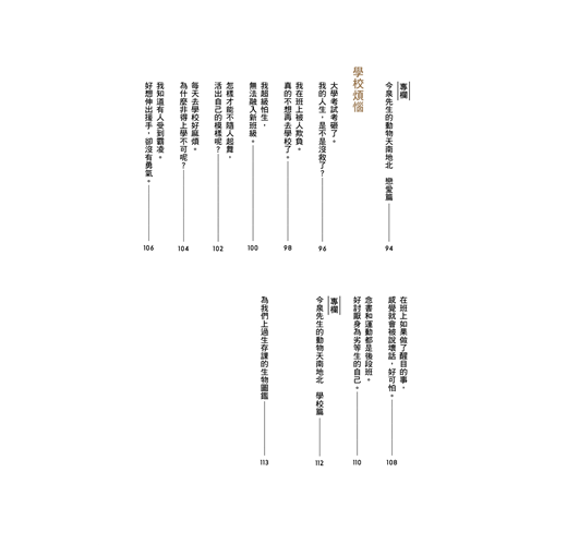 全書共分五大單元:生活、工作、家庭、戀愛、學校,一網打盡人生所有煩惱,吹散各個層面的愁雲慘霧。