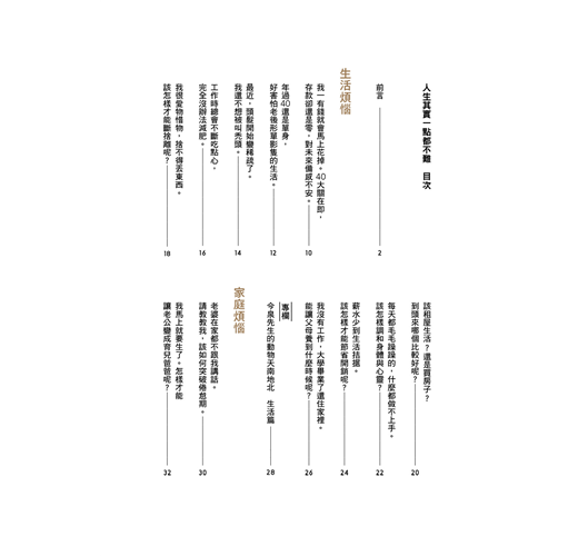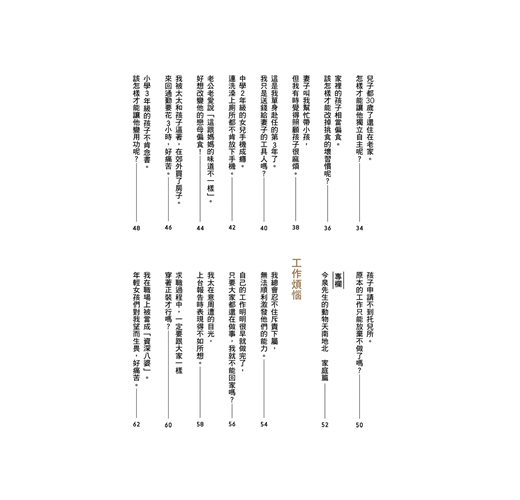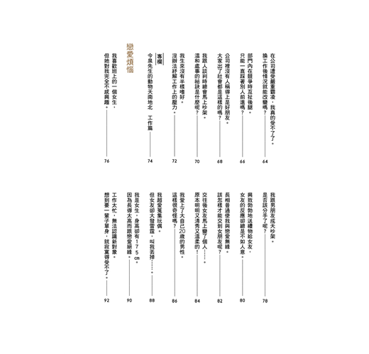 全書共分五大單元,職場、家庭、戀愛⋯⋯一網打盡人生所有煩惱。
