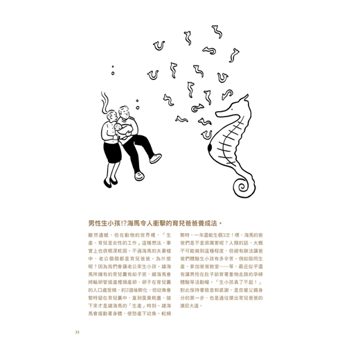雖然遺憾,但在動物的世界裡,「生產、育兒是女性的工作」這種想法,事實上也很根深柢固。不過海馬的夫妻檔,卻個個都是育兒爸爸。為什麼呢?因為我們會讓老公來生小孩。雄海馬所擁有的育兒囊有如子宮,雌海馬會將輸卵管插進裡頭產卵。卵子在育兒囊的入口處受精,經過約2週就會孵化,但幼魚會暫時留在育兒囊中,直到蛋黃耗盡,才來到雄海馬的「生產」時刻。雄海馬會搖動著身體,使勁產下幼魚。較頻繁時,一年還能生個3次!嘿,海馬的爸爸們是不是很厲害呢?人類的話,大概不可能做到這種程度,但一定有辦法,能讓爸爸們體驗生小孩有多辛苦。陪同生產、參加爸爸教室……最近似乎還有讓男性在肚子前背著重物走路的孕婦體驗等活動喔。「生小孩真了不起!」對此保持著敬意和感謝,是自覺父親身分的第一步,也是通往傑出育兒爸爸的康莊大道。