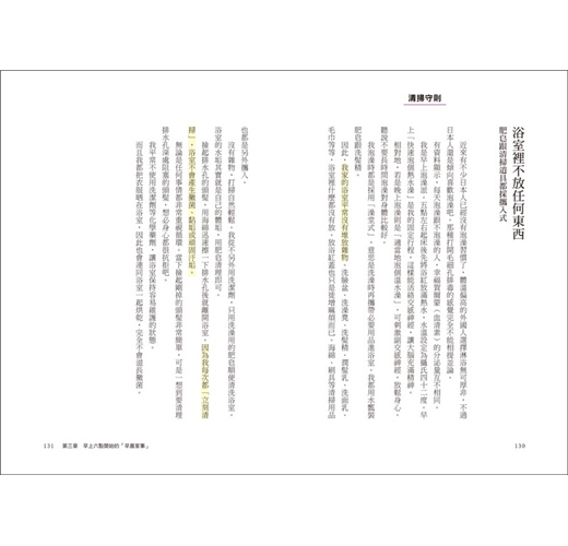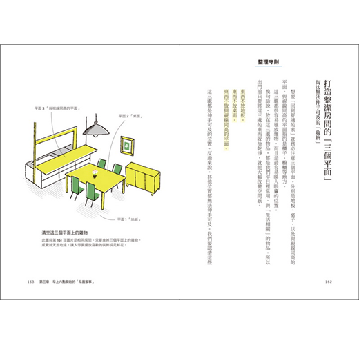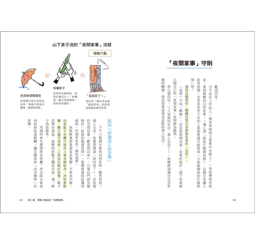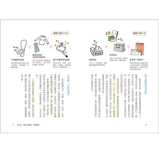 【特色3】符合現代人的忙碌日常,做家事只要利用早晨、夜間輕鬆實踐!把做家事的時間劃分為「早晨」、「夜間」和「週末」的三種時段,並根據生活作息來分配清潔整理的區域,一次只需要做一點點,輕鬆到不覺得自己在「做家事」。不論是朝九晚五的單身上班族、職場家庭兩頭燒的職業婦女,或是家庭主婦(夫),都絕對適合這套家事處理法。