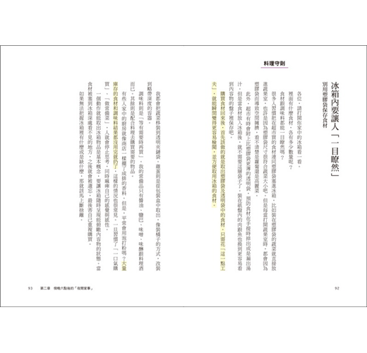 【特色5】不再被家事束縛、找回生活餘裕,在舒適空間裡享受自在人生!人不能停止思考,放棄思考就等於放棄了人生。在下廚、整理、打掃、洗衣的過程中,作者教你思考並找到自己真正想吃的、真正想擁有的生活方式和空間,讓那份舒適自在的快樂重新形塑出你的生活風格。