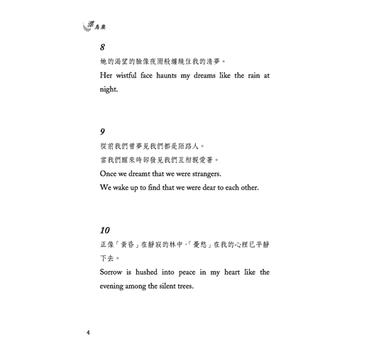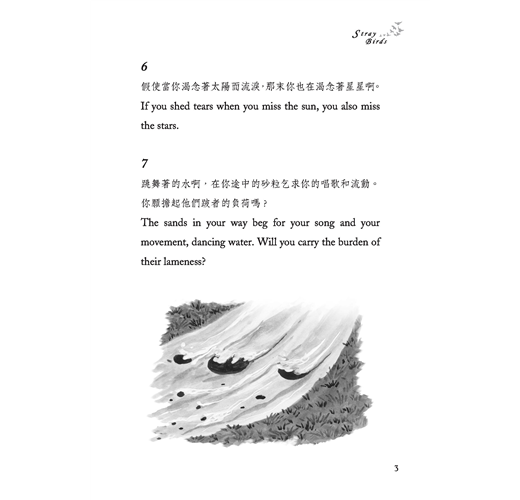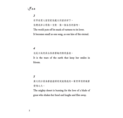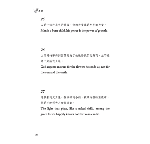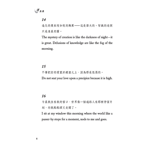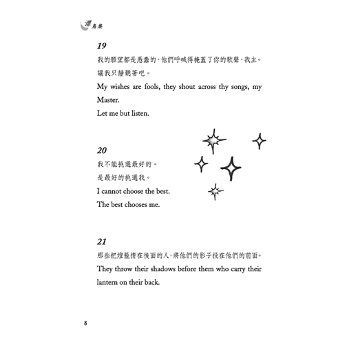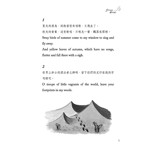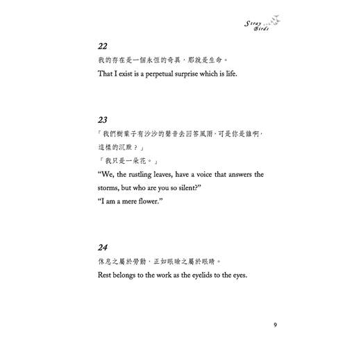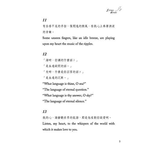 曾有位印度醫生說過:「每天讀一句泰戈爾的詩,使我立刻忘卻世上一切苦痛。」的確,泰戈爾《漂鳥集》的文字清新雋永,短短的語句像是捕捉了宇宙萬物的浮光掠影,十分深刻動人。