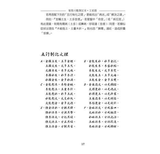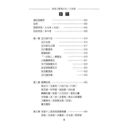 此次的「增訂版」,更是將「紫微斗數筆記本」系列的「主星篇」、「副星篇」、「格局篇」、「論命觀念篇」再做一次編排與整合,讓讀者在閱讀或學習上,透過增加的圖檔來理解或找尋相關資訊。