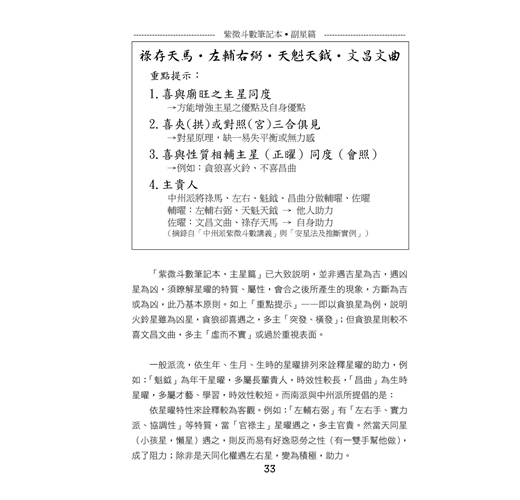 因此,在「紫微斗數筆記本‧副星篇」將不再每顆星曜前面做一個「星曜導讀」,由讀者看倌自行「聯想、想像、理解」,方能增強自己的記憶。