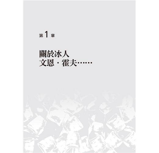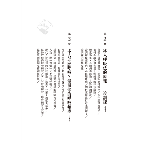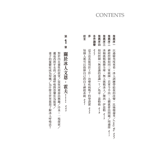 霍夫希望他的方法可以征服世界,而我就是那個心甘情願的白老鼠,開始做他的呼吸練習:不斷冰浴、練習強化我的意志,並寫下這一系列的體驗,也訪談許多開始使用這方法的人。這本書就是這些經驗的紀實,當然還有霍夫方法的技巧、背景和基礎。