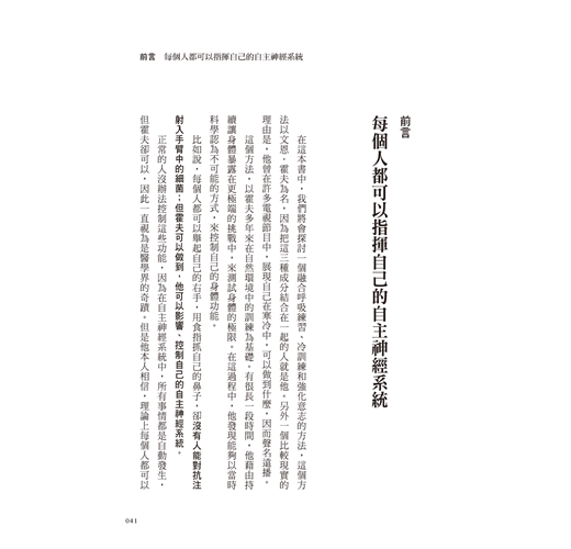 因此,如何調控自控的自主神經,或許這本書與冰人呼吸法都提供了可控的生理巧門,即冷訓練、呼吸訓練及意志力,讓讀者更能控制自己的身體運作。