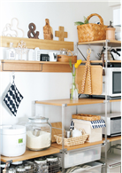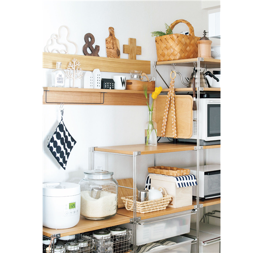 如果想要讓東西擺出來也好看,而不是全都藏進抽屜和門櫃,就要好好調整櫃子上「看得見」和「看不見」的比例平衡。開放式的櫃子雖然方便東西拿進拿出,能好好掌握東西的量和狀況,但容易看起來雜亂也是令人傷腦筋的問題。不過,只要在櫃子上加入收納用品就可以解決這個問題。