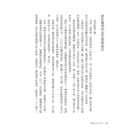 學校要換新課桌,需要交幾十元人民幣,她因為出不起這個錢,被調到了教室最後面,前面坐著的都是個頭比她高、擁有新課桌的人,她感覺非常痛苦,充滿羞恥。她曾經很認真地計畫過自殺,也就是所謂的「哲學式自殺」,即經過很認真的計算、衡量,覺得自己的人生確實是不值得擁有的。她曾經在一張白紙的兩邊分別寫下活著的理由和死去的理由,結果死去的理由遠超過活著的理由,於是,她認為自己應該自殺。