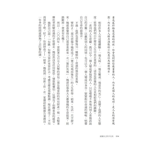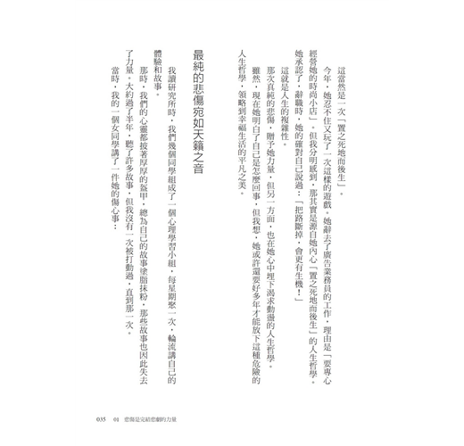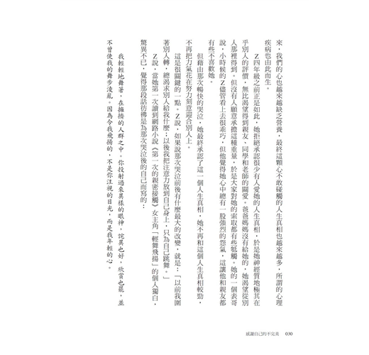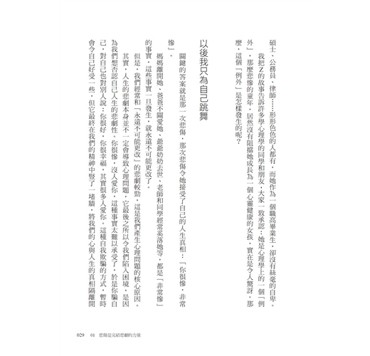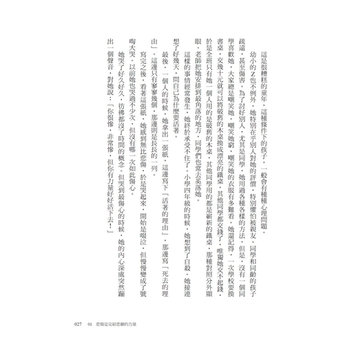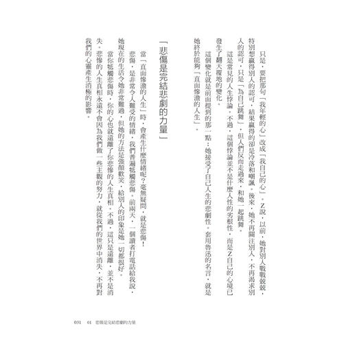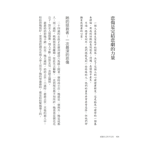 痛苦意味著什麼?這本書裡有一個故事很受歡迎,叫〈悲傷是完結悲劇的力量〉。故事是這樣的:女孩Z的童年非常不幸,兩三歲時父母離婚,父親掙不到錢,她基本上是跟著姑姑長大的。她不斷更換寄養家庭,小學時就已經覺得自己充滿痛苦。她努力討好老師、同學,卻總是不如願,她連一個朋友也沒有。