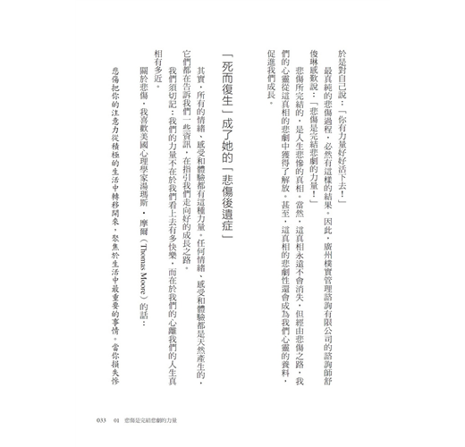 心理學書籍經常會強調悲傷,專業的說法叫哀傷過程,意思是:任何一份失去都會引起我們心中的悲傷,如果我們讓這悲傷流動,就意味著我們接受了喪失、接受了失去。悲傷的流動是需要時間的,所以當巨大的失去引起巨大的悲傷,讓巨大的悲傷在一定的時間內流完,這就是所謂的哀傷過程。