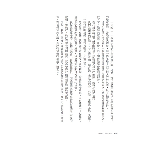 當你的人生遇見各種不幸,你會產生一個很本能的感覺,這個感覺就叫作悲傷,悲傷也許是所有的感受裡最重要的一種。你能否讓你的悲傷流動,意味著你是否能夠真的接受人生的真相,你是否真的有智慧。