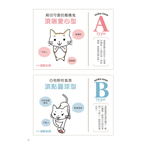 不僅提供各類型貓咪的性格分析,還包括飲食照料、日常保健的建議,以及如何排解牠的壞心情,甚至還要教你如何拍出各種不同性格貓咪的美照。