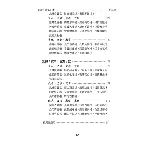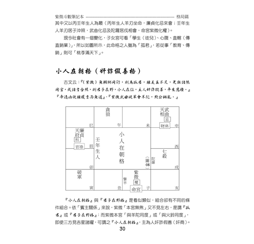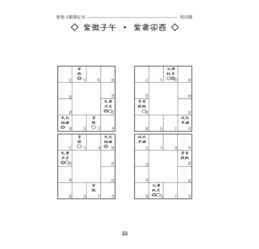至於「紫微斗數筆記本•格局篇」是將十四顆主星與諸多副星的組合或碰撞,以命宮為例,作各種的細部說明與比較。