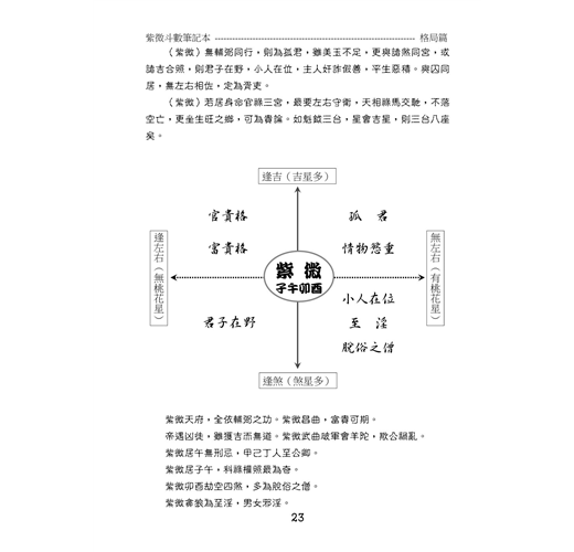 古文云:『帝坐命庫,則曰金車轝捧櫛。』又說『紫微居午無刑忌,甲己丁人至公卿。』『紫微居子午,科祿權照最為奇。』『(紫微)若得府相左右昌曲吉集,無有不貴,不然亦主巨富。』