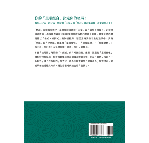 本書「格局篇」乃深受「中州派」的「斗數四書」啟蒙,更是將「星曜變化」的組合完整呈現。作者將數年來學習紫微斗數的心得,先以「歸納」再以「一分為二」或「二分為四」的方式,將各主星正曜的「星曜組合」整理成之,望初學者能透過此方式,更加容易理解組合的「差異」。