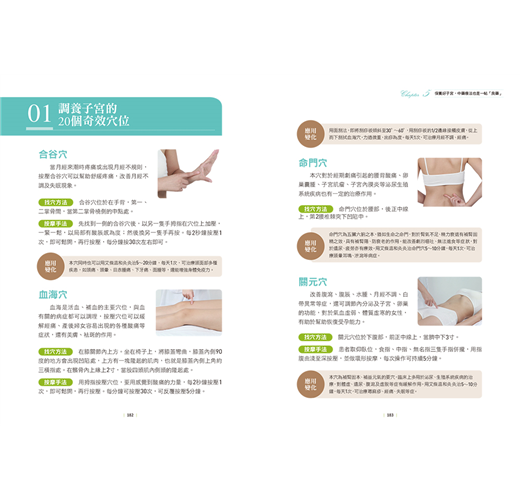 完全不受時間、地點限制,隨時想到就能做,每天花少少的幾分鐘按壓穴位,就能疏通經絡、活血化瘀,不讓子宮變「冷宮」,真正揮別宮寒體虛,護你一生。更收錄子宮肌瘤、子宮內膜炎、子宮頸炎等對症穴位,幫助改善病症。