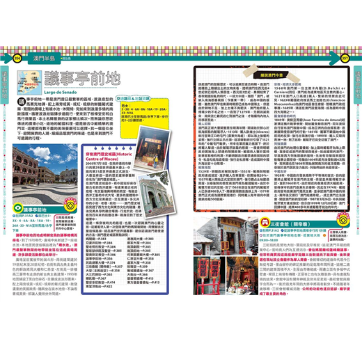.澳門半島:議事亭前地.大三巴牌坊.新馬路.福隆新街.清平直街.下環.西灣.新口岸.南灣.沙梨頭.三盞燈.東望洋山.荷蘭園.北區
