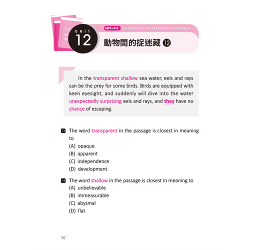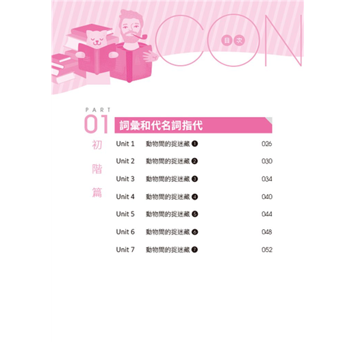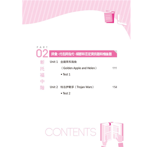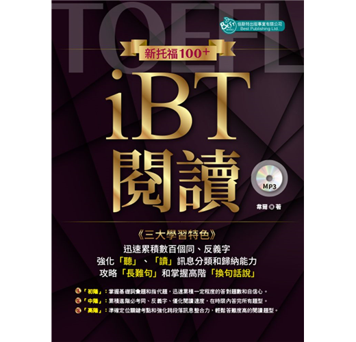 新托福閱讀包含了十種閱讀題型,其中詞彙題和代名詞指代題是最易得分的項目。詞彙題僅牽涉到是否背過該字彙、了解該字彙的同反義字,而更進階或較難的可能需要再閱讀該字的文句,理解下上下文意後就能答對。代名詞指代題則是理解各式在國小、國中即學過的代名詞,並理解該代名詞在前後文句中指代的名詞為何就能答對該題,其中僅須注意別被文句中其他干擾選項影響答題即可。這兩類的題型,很容易掌握而且當中未牽涉需要太多的思考或跨篇章理解文句後才能判題的部分。在新托福閱讀測驗中,這兩類題型的題數也多,對於基礎型學習者更能藉由這類的題型和答對題數累積信心,較不會因為寫完一整回官方試題後,錯的題數過多而影響備考心情。在書中,將這兩類題型合併成新托福初階篇的內容,每個單元中包含了一小段的閱讀文章,每篇閱讀文章都包含了題數總數六題的詞彙題和代名詞指代題。每回的解析中更包含了每個題目中的同、反義字擴充,熟記這些必考字能大幅提升應試能力。每個小段落都附錄音且每單元與單元的文章是連續性的,可以當成故事在讀,並藉由搭配音檔練習強化由聽段落記憶當中的字彙和理解該字的用法。