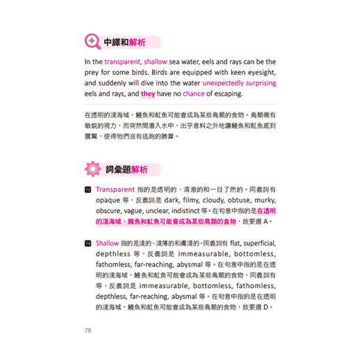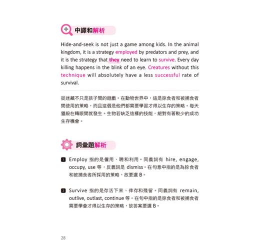 修辭目的題其實最主要的是了解寫作者寫這個字、句等的目的,作者在這個段落中寫出這個字或句都是有目的的,可能是要提醒讀者或者是對於某個現象感到吃驚,算是比較隱含意思方面的理解,書中是由一篇自然現象來介紹這個題型,可以一次演練數個修辭目的題。另外要注意的是要避免將正確答案與段落中提過的訊息混淆到而選錯了。再來是內容總結題,這部分其實沒有想像中難,可以回歸到學習閱讀一個句子時,每個句子都會有較不重要的部分(minor details)或支持性的細節(supporting details),其實在看完一整列選項後,刪除這兩部分,就能看到康莊大道,選出正確答案,而主要提到的部分其實就剩那幾個選項。