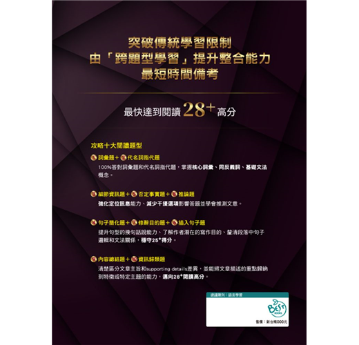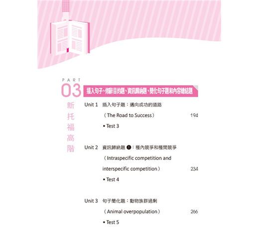 書籍中除了介紹十個新托福考試題型外,在每個題型外,均設計了整合能力強化的架構,包含了便於考生閱讀的中英對照的設計,考生可以搭配音檔聽,並記憶字彙和長句,強化寫作能力。有些單元另加上了區分主要事件和人物、列出同、反義字、同義字長句改寫的填空練習、配對題等,最後的宗旨都是協助考生理解其他考點和由其他題型設計強化閱讀能力,最終獲取理想成績。最後要感謝倍斯特出版給予本人出書機會並祝考生都能在最短時間內獲取理想成績。
