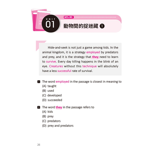 最後的題型是資訊歸納題,其實這部分和聽力與閱讀關聯性極高,都是考驗學習者在聽或讀完一個段落後能否將文中提到的主要人物、動物或現象等,與各個段落中提到的相關訊息做出搭配。書籍中的閱讀文章均附音檔,所以也可以用聽的訓練自己聽完一篇文章後能否將聽到的訊息做出歸類。
