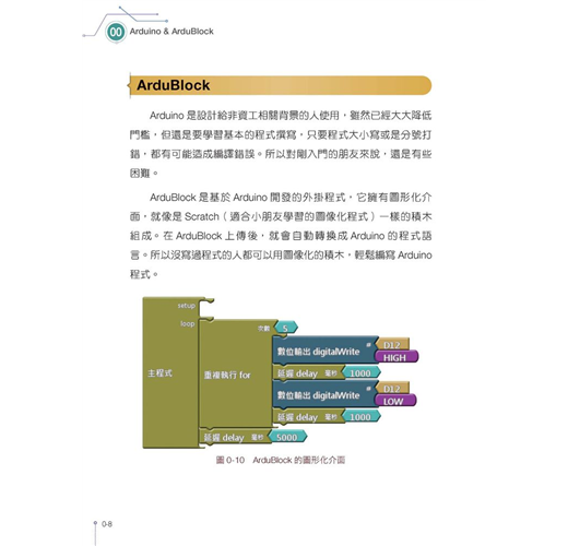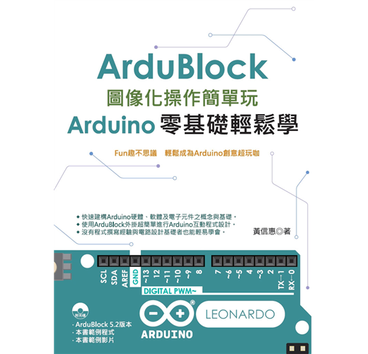 本書運用Ardublock圖像化界面,讓您能以極簡易的方式學習操作Arduino,即使沒有程式撰寫與電路基礎的初心者也能輕鬆上手。