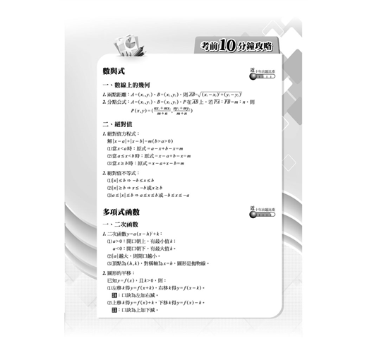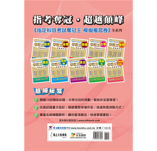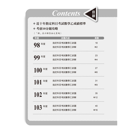 特別收錄考前10分鐘攻略,依據近十年出題率及最新課綱強弱化程度,將指考測驗範圍內的各主題擇其重點精要編入,以期學子在最短時間內能掌握重要基礎概念及定理。