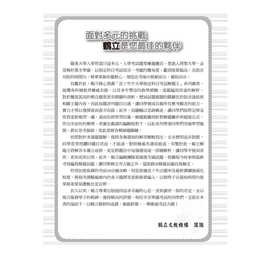 指定科目考試的難易度、鑑別度都偏高,唯有在有限時間內精準掌握命題核心,才能在考場中脫穎而出、獲取高分。鶴立文教機構逐年更新試題,讓同學隨時掌握最新考試資訊,一舉衝破考試大關。