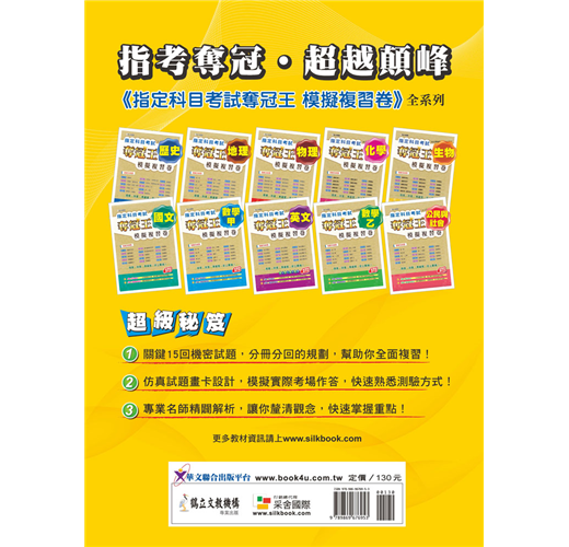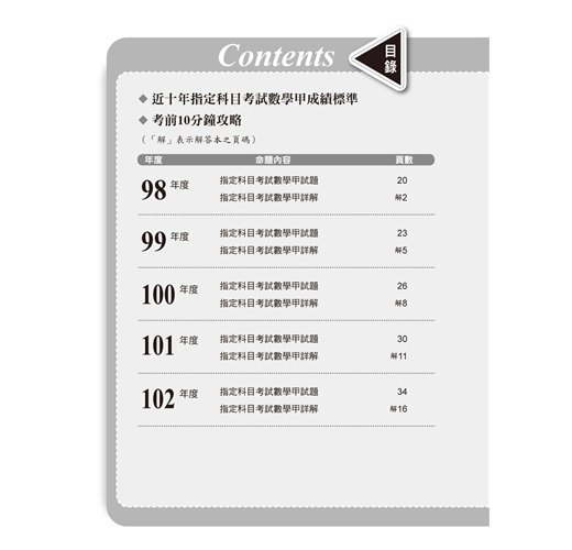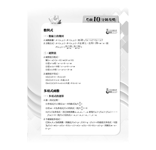 特別收錄考前10分鐘攻略,依據近十年出題率及最新課綱強弱化程度,將指考測驗範圍內的各主題擇其重點精要編入,以期學子在最短時間內能掌握重要基礎概念及定理。