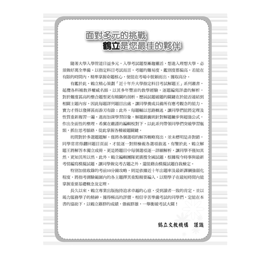 鶴立編輯團隊廣搜全國試題,並根據現今實事與最新考情編寫模擬試題,讓同學做完考古題之外,還能藉由模擬試題自我檢定。