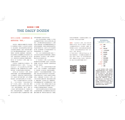 我很榮幸,能聽到來自無數民眾分享他們對於《食療聖經》的熱愛,以及從高中生到研究生,甚至是教授,都告訴我他們將這本書作為論文或授課的必備資源。沒錯!我從科學文獻中引用了幾千篇經過專業審查的論文,但我不只是想要寫一本參考書;我還想創造一本實用指南,把這些堆積如山的證據轉化成容易做到的日常決策。這就是我設計《食療聖經》第二部分的方式,我把所有自己試著放進日常慣例的事物,集中成一份「每日飲食十二清單」建議,並且也鼓勵你這麼做。