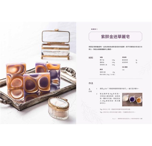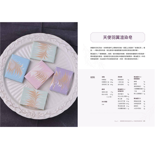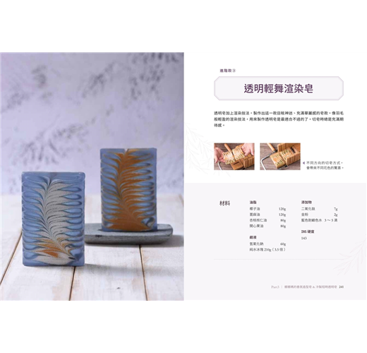 ▍娜娜媽最新研發皂款──香氛造型皂 & 冷製短時透明皂.漸層、羽毛渲等造型香氛皂:求新求變的娜娜媽,不斷的在手工皂外型、技法、洗感進行提升,並搭配本書獨特的香氛配方,做出讓人驚豔的漸層皂/大理石皂/羽毛渲染皂等手工皂。