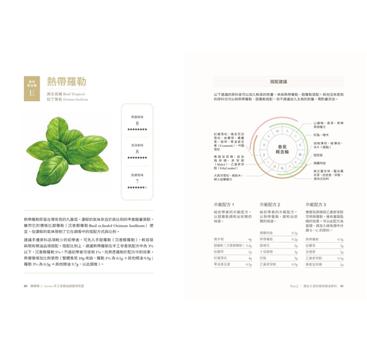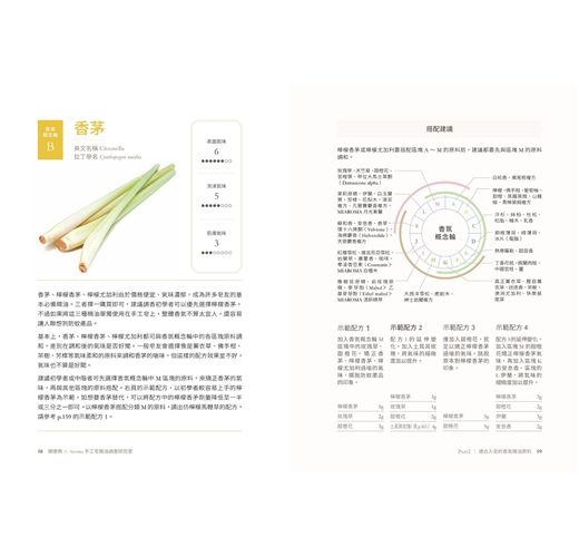 可擺脫防蚊產品的印象。每個精油原料皆有三組香氛配方應用,並告訴你搭配理由與可呈現的氣味印象。