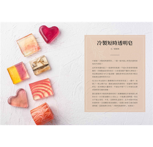 .「冷製短時透明皂」配方&技巧大公開:近年來皂圈吹起了透明皂風潮,但大多是含有化學成分的胺基酸皂,娜娜媽僅以油、鹼、水的調配,製作出一個個有如藝術品般的透亮皂體,並將製作技法、成功重點無私公開。
