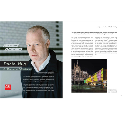 畫廊營運急遽升高的成本,為藝術博覽會的經營帶來變數。超級畫廊在全球主要都市設有營業據點,在銷售作品時他們對藝術博覽會的依賴可能相對較低。但對中小規模的區域型畫廊而言,一年光只要參加三到四個藝術博覽會,就需耗資不斐。為了找出一個理想的解決方案,我們研究了德國科隆藝博會這幾年的策略改變與營運績效,並決定邀訪科隆藝博會的藝術總監丹尼爾.赫格,由他獲選為年度的藝術風雲人物。在專訪中他明確傳達傑出的理念與作法,為全球畫廊業者及藝博會主事者帶來跳脫框架的思考。