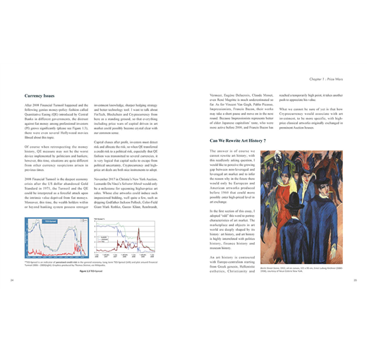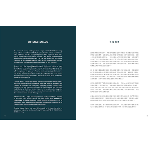第一章〈資本驅動的價格戰爭〉是在處理藝術價格快速發展的主題。牽動藝術價格的因素有諸多面向:高淨值族群面臨財富管理的法規異動、貨幣課題、藝術史中長期存在的歐洲中心觀點。較起經濟、藝術是一個在發展演進上緩慢許多的領域。從現在到不久的未來,可以預見的是,全球藝術市場的產業樣貌將愈趨展現金融業屬性,由資本驅動的藝術交易現象亦將持續發生。